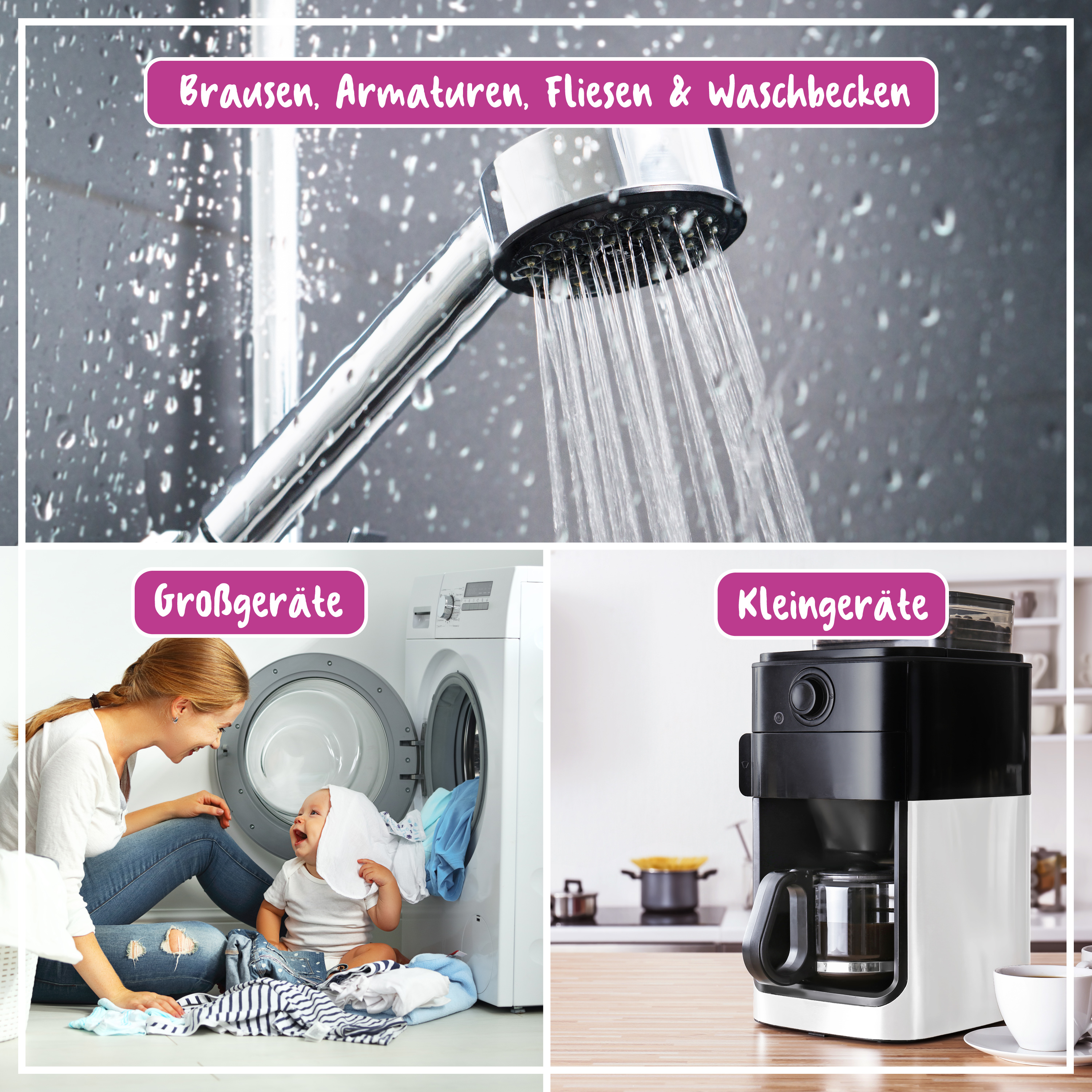 Sanitär: Mit feuchtem Tuch oder Schwamm z.B. pur auf Duschwänden, Armaturen, Brausen, Fliesen und Oberflächen aus Edelstahl, Keramik, Glas, Kunststoff oder Chrom auftragen. Ca. 2 Minuten einwirken lassen und danach mit klarem Wasser nachspülen.